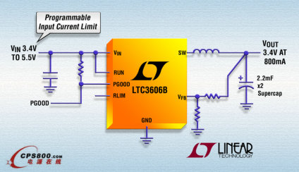 LTC3606B 提供一個可編程的平均輸入電流限制,該限制可在 200mA 至 800mA 之間通過單個電阻器以 ±5% 的準確度編程。這使 LTC3606B 非常適用于 USB 應用、超級電容器充電和負載點電源。對于 GSM 放大器等應用來說,LTC3606B 與一個超級電容器結合,能使輸出提供高達 2A 的高峰值負載電流,而不會使輸入電源崩潰。它還運用低壓差 100% 占空比工作,允許輸出電壓等于 VIN,從而進一步延長了電池運行時間。LTC3606B 采用脈沖跳躍模式來優化輕負載效率,同時在要求噪聲盡可能低的應用中最大限度地降低開關干擾。其它特點包括獨立軟啟動和電源良好指示、短路保護和內部補償。LTC3606B 是手持式應用的理想解決方案,這類應用需要輸入電流限制、高達 800mA 的輸出、高效率和占板面積非常小的解決方案。