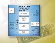 DS1874采用0.35µm技術(shù),能夠在帶裸焊盤的小尺寸5mm x 5mm、28引腳TQFN封裝中實現(xiàn)所有的SFF-8472功能。該款SFP+控制器工作在-40°C至+95°C溫度范圍。■