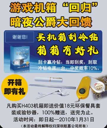 1月31日前,消費(fèi)者購買暗夜公爵H403機(jī)箱即送價(jià)值18元環(huán)保餐具套裝(或價(jià)值18元驗(yàn)鈔器一個(gè)),100%贈(zèng)送。此外,每款機(jī)箱內(nèi)配有刮刮卡,購買時(shí)當(dāng)即刮卡,即有機(jī)會(huì)中得價(jià)值228元的冷鉆電源一臺(tái)。暗夜公爵H403現(xiàn)在報(bào)價(jià)338元,感興趣的用戶可以到航嘉店面咨詢。