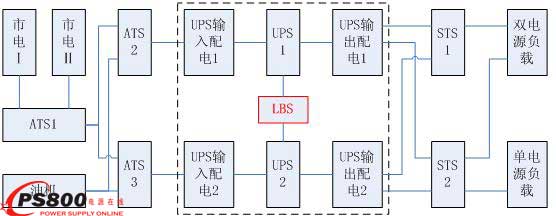 傳統雙總線系統兩路UPS之間需使用總線同步控制器(LBS)進行同步控制,使得兩路UPS輸出電壓同頻、同相、同幅值,才能夠保障STS的安全轉換提供必要的條件,因為總線同步控制器的工作狀態同時與雙總線的兩路UPS有關,如果總線同步控制器LBS發生故障將會造成整個系統的不正常工作,所以在系統形成了單路徑故障點。傳統雙總線系統方框圖如下: