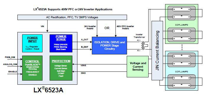 Microsemi的CCFL逆變器控制器LX6523A(TM)是第一個嵌入該公司擁有的百萬分之一對比度亮度調整專利技術PureBLACK(TM) 的新產品,此項技術是由Xiaoping Jin博士開發出來的。由于Jin氏的平衡器(Balancer)能夠動態地調整燈電壓,使多燈電流匹配的偏差極小,從而得到了Microsemi設計開發工程師的廣泛采用。PureBLACK技術通過Jin平衡器來確保在非常小的占空比下,燈被觸發起弧的能力,因而能夠產生高品質的“黑色”電平和動態對比度性能。