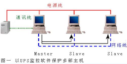 (1) 一是在每一部主機(jī)上安裝監(jiān)控軟件,直接與UPS聯(lián)機(jī)的計(jì)算機(jī)設(shè)為Master,其余的設(shè)為Slave (圖一)。當(dāng)Master偵測(cè)到UPS有任何異常電力事件時(shí),它會(huì)通知Slave主機(jī)。然后各監(jiān)控軟件依照自己設(shè)定的時(shí)間進(jìn)行關(guān)機(jī)程序最后再關(guān)閉UPS。