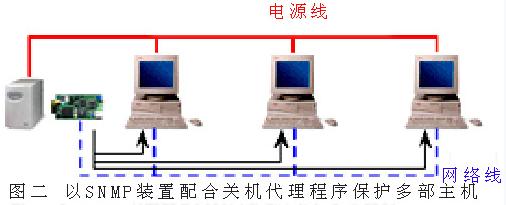 (2) 另一種方式是在UPS加裝SNMP網(wǎng)絡(luò)卡,而在各主機(jī)安裝關(guān)機(jī)代理程序 (圖二)。當(dāng)市電中斷時(shí)SNMP網(wǎng)絡(luò)卡會(huì)主動(dòng)送出Trap給關(guān)機(jī)代理程序,關(guān)機(jī)代理程序在收到通知后會(huì)進(jìn)行倒數(shù)關(guān)機(jī)程序。采用SNMP網(wǎng)絡(luò)卡的好處是它不需透過(guò)計(jì)算機(jī)可直接上網(wǎng),適用于UPS與主機(jī)距離較遠(yuǎn)的情況。