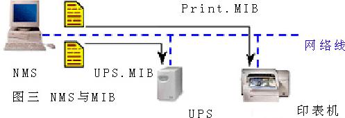 為了能有效管理網(wǎng)絡(luò)上眾多的設(shè)備,如服務(wù)器、集線器等通訊設(shè)備,或打印機(jī)、UPS等外圍設(shè)備,管理者會(huì)架設(shè)一部NMS(Network Management Station) 讓各裝置也就是SNMP Agent將資料響應(yīng)給NMS。由于各裝置的制造廠商皆不相同,故需有一套共同的語(yǔ)言讓NMS與各裝置交談,這個(gè)語(yǔ)言也就是網(wǎng)絡(luò)上所謂的通訊協(xié)議,而目前應(yīng)用于網(wǎng)管通訊協(xié)議最普遍的就是SNMP(簡(jiǎn)單網(wǎng)絡(luò)管理通訊協(xié)議)。雖有了共同的語(yǔ)言但這些裝置仍需提供此裝置可被監(jiān)控的對(duì)象描述,也就是MIB(管理信息庫(kù))給NMS。根據(jù)MIB,NMS才能對(duì)此裝置做出正確的詢問(wèn)并下達(dá)正確的命令 (圖三)。雖然RFC1628規(guī)范了一般UPS的MIB但仍不能滿足現(xiàn)有網(wǎng)絡(luò)UPS的需求,故各大UPS廠商仍然自定其私有的MIB來(lái)發(fā)揮自己UPS的特殊功能。