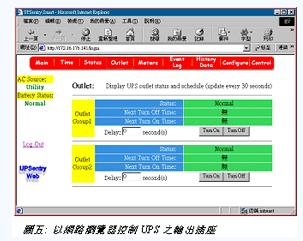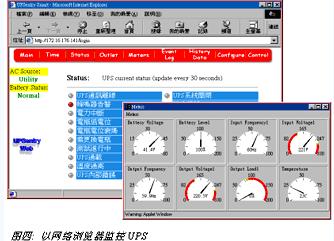 另一項(xiàng)網(wǎng)絡(luò)UPS的特殊功能則是遠(yuǎn)程監(jiān)控。由于目前網(wǎng)際網(wǎng)絡(luò)的盛行,幾乎每部計(jì)算機(jī)皆配備網(wǎng)絡(luò)瀏覽器,近來(lái)許多Linux業(yè)者采用網(wǎng)絡(luò)瀏覽器來(lái)作為系統(tǒng)設(shè)定與監(jiān)控的接口。一些UPS大廠亦看準(zhǔn)此一趨勢(shì)紛紛將HTTP通訊協(xié)議加入其監(jiān)控軟件與SNMP卡之中 (圖四)。它的好處是在遠(yuǎn)程無(wú)須加裝任何程序,管理者隨時(shí)隨地皆可以網(wǎng)絡(luò)瀏覽器得知UPS的最新狀態(tài)。