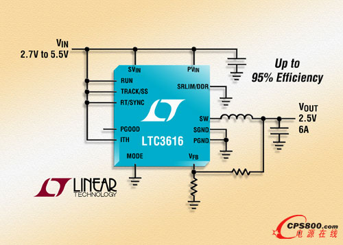 凌力爾特公司 (Linear Technology Corporation) 推出高效率、4MHz 同步降壓型穩(wěn)壓器 LTC3616,該器件采用恒定頻率、電流模式架構(gòu)。低電阻內(nèi)部開關(guān)允許采用 3mm x 5mm QFN 封裝的 LTC3616 提供高達(dá) 6A 的連續(xù)輸出電流,而且其低壓差工作允許范圍從 0.6V 直到僅比 VIN 低數(shù) mV 的輸出電壓。LTC3616 采用 2.25V 至 5.5V 的輸出電壓工作,從而非常適用于單節(jié)鋰離子電池應(yīng)用以及 3.3V 或 5V 中間總線系統(tǒng)。其開關(guān)頻率范圍為 300kHz 至 4MHz,是用戶可編程的,從而可使用纖巧、低成本電容器和電感器。