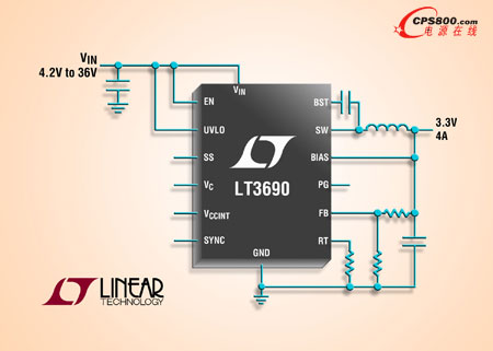 照片說(shuō)明:36V、4A (IOUT)、同步降壓型開(kāi)關(guān)穩(wěn)壓器