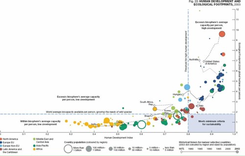 圖1. 技術越先進的國家,其生態科學發展的軌跡越明顯(來源:世界自然基金會2006年《地球生命力報告》)