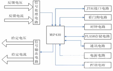 本系統(tǒng)采用MSP430F155型號(hào)單片機(jī)實(shí)現(xiàn)對(duì)開關(guān)電源的穩(wěn)定控制,主要包括如下幾個(gè)部分:MSP430核心部分、反饋信號(hào)處理部分、信號(hào)輸出給定部分、控制電路部分、通訊部分及CPU外圍電路。系統(tǒng)總體結(jié)構(gòu)如圖1所示: