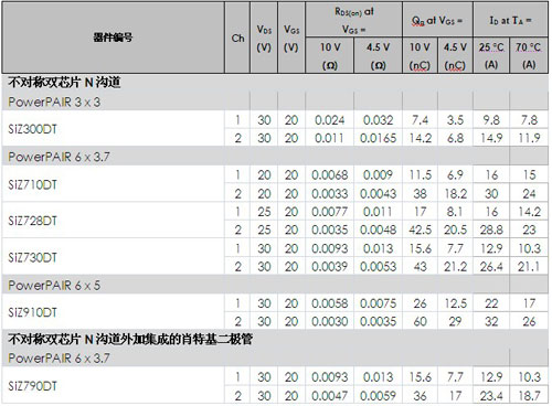 下表提供了所有五款新器件及SiZ710DT的詳細性能規格。