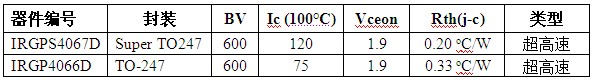IRGPS4067DPbF 和IRGP4066DPbF新器件采用溝道纖薄晶圓技術,可減少傳導及開關損耗。新器件與軟修復 Orr 二極管一起封裝,通過 5us 短路額定值來優化超高速開關 (8KHz-30KHz),并且具備有助于并聯的低 Vce(on) 和正 Vce(on) 溫度系數。