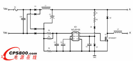 圖7:NCL30000高功率因數降壓方案應用電路
