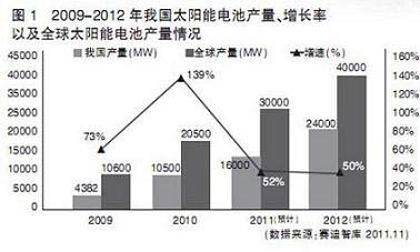 2009-2012年我國太陽能電池產(chǎn)量、增長率以及全球太陽能電池產(chǎn)量情況