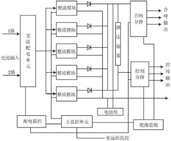 智能高頻開關電源系統的總體結構主要由主監控單元、配電模塊、交流配電單元、整流模塊等組成,系統總體的結構圖如圖1所示。系統中的各個監控單元受主監控單元的管理和控制,通過通信線將各個監控單元采集的信息送給主監控統一管理。主監控顯示直流系統各種信息,用戶也可以觸摸顯示屏查詢信息及操作,系統信息還可以接入到遠程監控系統中。系統除了交流監控、直流監控、開關量監控等基礎單位外,還配置了絕緣監測、降壓裝置、電池巡檢等功能單元,以達到對直流系統進行全面監控的目的。