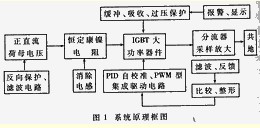 放電系統的組成包括了IGBT功率器件部分、PWM集成驅動電路部分、采樣放大、比較、反饋部分。系統原理框圖如圖1所示。