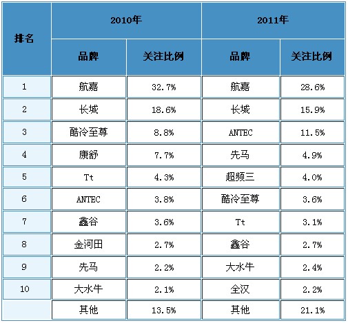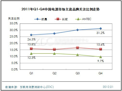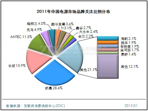 2011年中國電源市場中用戶的關注焦點集中于個別品牌,使其在市場中獲得較大的優(yōu)勢。航嘉、長城、ANTEC等少量重點品牌在市場中占據(jù)大部分關注份額。