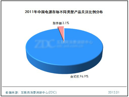 臺式機電源與服務器電源是現(xiàn)階段國內(nèi)電源市場的兩個重要組成部分。在這兩大類電源中,臺式機電源在市場中占據(jù)絕大部分關注份額,其關注比例達到96.9%。