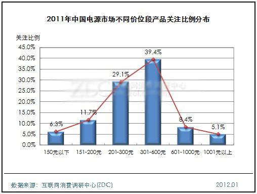 雖然高端產(chǎn)品正在走入越來越多的用戶的視野,但是在2011年國內(nèi)電源市場中,601元以上產(chǎn)品僅擁有13.5%的關注比例,中低端產(chǎn)品仍展現(xiàn)出較為強大的實力。