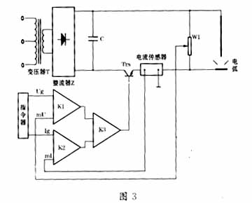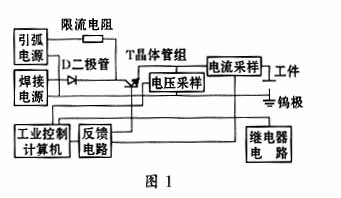 焊接設備的各組成部分作用如下:引弧電源部分在焊接引弧時提供高壓,方便了順利地引弧,串聯限流電阻R防止引弧電源在焊接回路中產生大電流,此外,二極管D防止引弧時電流反向流經焊接電流;焊接電源為焊接回路提供大電流;晶體管組部分用于控制焊接電流;繼電器電路部分輸出開關信號,如高頻發生器的通短等;焊接電流采樣電路部分對焊接電流進行采樣,輸出到反饋電路,進行電流控制。