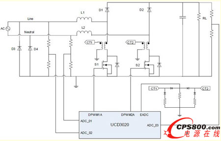 在其他無橋PFC拓?fù)浣Y(jié)構(gòu)中,圖1是一個(gè)已被業(yè)界廣泛采用的無橋PFC實(shí)例。它具有兩個(gè)DC/DC升壓電路,一個(gè)由L1、D1和S1組成,另一個(gè)則由L2、D2和S2組成。D3和D4為慢恢復(fù)二極管。通過參考內(nèi)部電源地,分別檢測(cè)線路(Line)和中性點(diǎn)(Neutral)電壓,測(cè)量得到輸入AC電壓。通過對(duì)比檢測(cè)到的線路和中性點(diǎn)信號(hào),固件便可知道它是一個(gè)正半周,還是一個(gè)負(fù)半周。在一個(gè)正半周內(nèi),第一個(gè)DC/DC升壓電路(L1-S1-D1)有效,并且升壓電流通過二極管D4回到AC中性點(diǎn);在一個(gè)負(fù)半周內(nèi),第二個(gè)DC/DC升壓電路(L2-S2-D2)有效,并且升壓電流二極管通過D3回到AC線。像UCD3020這樣的數(shù)字控制器用于控制這種無橋PFC。