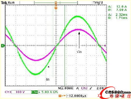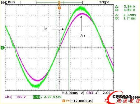 圖5 低壓線路的VIN和IIN波形(VIN=110V,負(fù)載=1100W,THD=2.23%,PF=0.998)