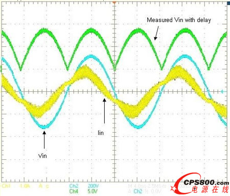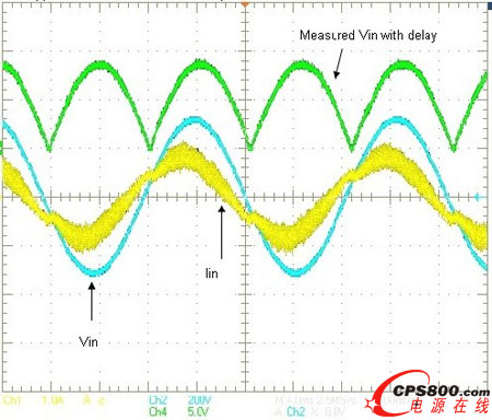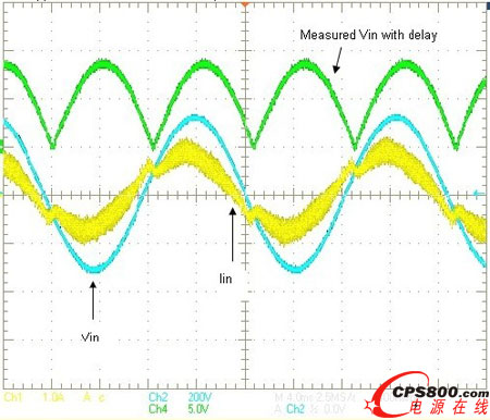 首先,輸入AC電壓通過ADC測(cè)量。固件讀取測(cè)量到的電壓信號(hào),再加上一些延遲,然后使用延遲后的信號(hào)來生成電流參考。圖7、8顯示了1100W無橋PFC的測(cè)試結(jié)果。在該測(cè)試中,VIN=220V,VOUT=360V,而負(fù)載=108W(約滿載的10%)。通道1為IIN,通道2為VIN,通道4為帶延遲的測(cè)量到的VIN信號(hào)。圖7中,測(cè)量到的VIN沒有增加延遲,PF=0.86,THD=8.8%.而在圖8中,測(cè)量到的VIN信號(hào)被延遲了300us,這種情況下,PF被改善到0.90.此外,還可以進(jìn)一步改善PF,但這將以犧牲THD為代價(jià),因?yàn)檫M(jìn)一步延遲電流參考,將在AC電壓交叉點(diǎn)處產(chǎn)生更多的電流失真。在圖9中,測(cè)量到的VIN被延遲了500us,此時(shí),PF被改善到0.92.但是,電流在電壓交叉點(diǎn)處出現(xiàn)了失真。結(jié)果,THD變得更糟糕,達(dá)到11.3%。