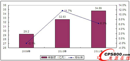 根據(jù)ICTresearch研究調(diào)查顯示,2011年UPS整體銷售額達到近34.69億元,同比增長略低于GDP增速,增長率為6.3%。主要原因為2011年中小企業(yè)普遍發(fā)展乏力,破產(chǎn)企業(yè)增多,資金鏈非常緊張甚至斷裂;行業(yè)季度采購和2010年同比顯示都增長不大,甚至有萎縮的傾向;2011年UPS廠商資金充裕的企業(yè)價格會調(diào)低,資金稍緊的企業(yè)價格會調(diào)高5-8個百分點。