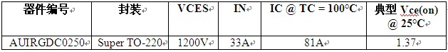 1200V AUIRGDC0250 采用緊湊的 Super TO-220 封裝,低 VCE(on) 可讓該器件降低功耗并實現更高的功率密度,正 VCE(on) 溫度系數則使其更適合并聯。此外,AUIRGDC0250 還提供經過優化的方形反向偏壓安全操作區 (RBSOA)。AUIRGDC0250 的軟開關特性使其成為幫助客戶符合系統級 EMI 規范的理想選擇。
