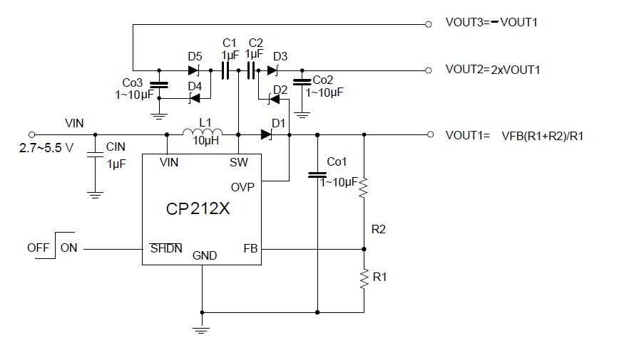 本文介紹了采用低成本、高效率的升壓型電源管理芯片CP212X系列產品實現多路正負電源輸出,結合TFT模組供電的需求,給出了基于CP212X實現的TFT模組供電系統方案,文中詳細討論了CP212X系列產品實現多路正負電壓輸出的解決方案,并以TFT模塊的供電系統為典型案例,給出了基于CP212X的TFT模組供電系統的典型應用方案。該方案可滿足TFT模組供電系統的各路電壓需求,電路清晰簡單,應用靈活,可廣泛應用于各類手持設備,為TFT模組提供全套電源解決方案。