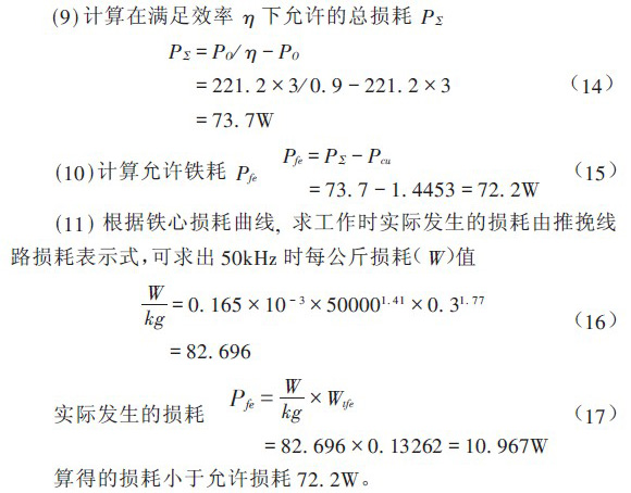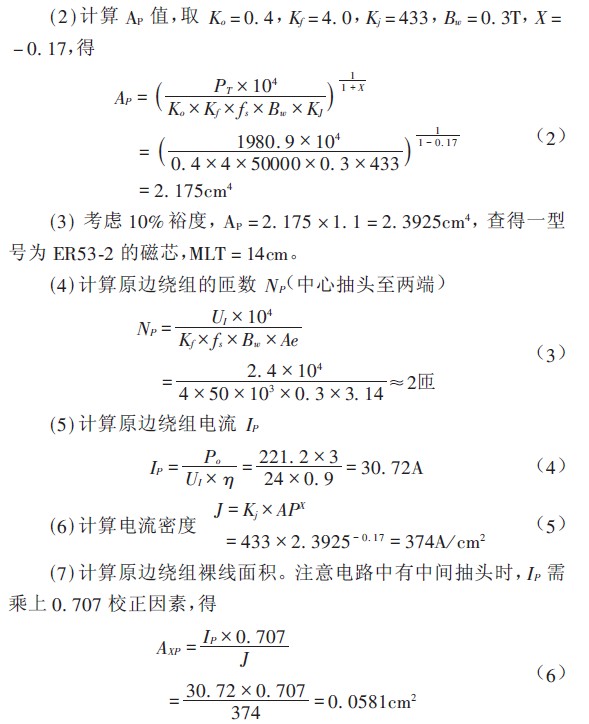 采用面積乘積(AP)法進行設計。對于推挽逆變工作開關電源,原邊供電電壓UI=24V,副邊為全橋整流電路,期望輸出電壓UO=220V,輸出電流IO=3A,開關頻率fs=25kHz,初定變壓器效率η=0.9,工作磁通密度Bw=0.3T.