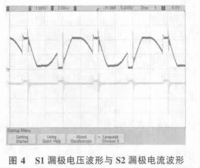 當S1的PWN 信號下降沿來臨,S1關斷,漏極產生較高的沖擊電壓,并使得與S2并聯的反饋能量二極管FWD2導通,形成能量回饋回路,此時S2漏極產生較高的沖擊電流,見圖4。