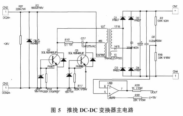 圖5為簡化后的主電路。輸入24V 直流電壓,經過大電容濾波后,接到推挽變壓器原邊的中間抽頭。變壓器原邊另外兩個抽頭分別接兩個全控型開關器件IGBT,并在此之間加入RC吸收電路,構成推挽逆變電路。推挽變壓器輸出端經全橋整流,大電容濾波得到220V直流電壓。并通過分壓支路得到反饋電壓信號UOUT。