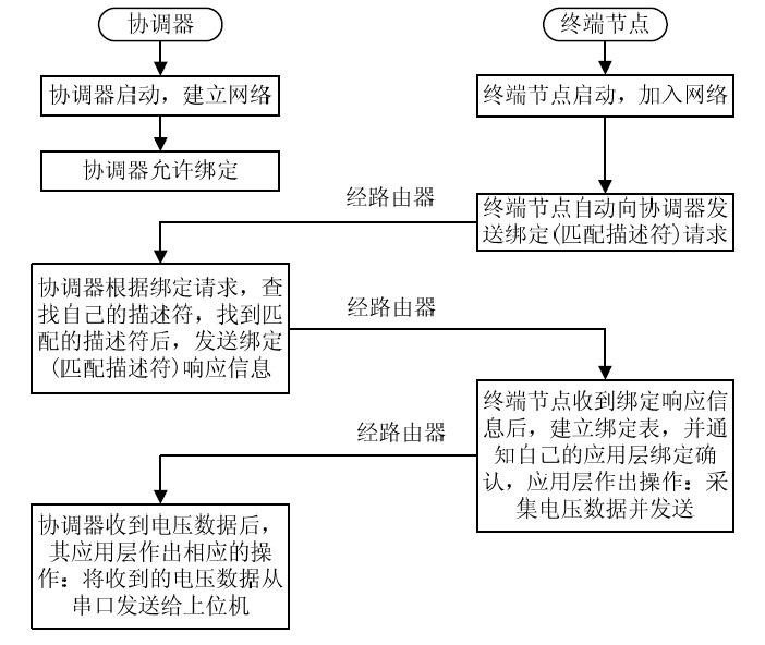 終端節點在系統中的作用是采集電源電壓數據,并通過與協調器建立"綁定"將電壓數據發送給協調器,同時接收協調器發來的控制命令,控制采集/保護模塊中的繼電器和蜂鳴器做出相應的操作。在終端節點以終端的身份啟動并加入網絡后,即開始與協調器建立綁定。一旦一個綁定被創建,終端節點就可以在不需要知道明確的目的地址的情況下發送數據。其與協調器建立綁定及電壓數據傳遞的完整程序流程如圖5 所示。