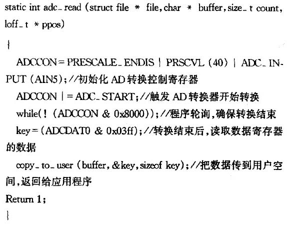 對AD轉換器設備文件進行讀操作時調用adc_read()子程序。電池監測系統要求實時讀取外設監測點的電壓值。因此,在adc_read()函數中實時觸發AD轉換器開始工作,并且利用程序輪詢方式讀取轉換后的數據。adc_read()函數內容如下: