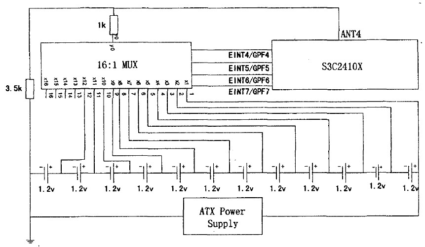 監測系統利用S3C2410x自帶的AD轉換器將模擬電壓輸入轉換為應用程序所需要的數據。芯片自帶AD轉換器為8路模擬輸入、10bit數字輸出,最大轉換率為500ksps,轉換時鐘為2.5MHz,模擬輸入范圍為0-3.3V.本系統所需要監測的電壓范圍為0~14。