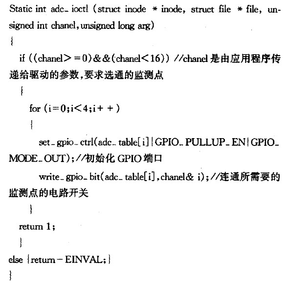 控制外圍的輔助電路時調用adc_iocd()函數。對照監測點邏輯控制表,從S3C2410x的GPIO端口發出選擇指令,接著就可以進行讀操作以讀取相應的數值。在不需要監測時,控制監測系統進入省電模式。