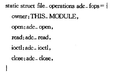 系統內部,I/O設備的存取使通過一組固定的入口點來進行的。這組入口點由特定設備的設備驅動程序提供,在數據結構file_operatiONs()中定義。該程序定義了一個數據結構為file_operations()的變量adc_fops。