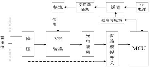 V/F轉(zhuǎn)換法的原理圖如圖1所示,其工作原理如下:信號(hào)采集采用V/F轉(zhuǎn)換的方法,單節(jié)蓄電池采用分別采樣,取單節(jié)蓄電池的端電壓經(jīng)分壓(降低功耗)后作為V/F轉(zhuǎn)換的輸入,分壓電阻的分散性可通過(guò)V/F轉(zhuǎn)換電路調(diào)整V/F轉(zhuǎn)換信號(hào)輸出通過(guò)光電隔離器件送到模擬開(kāi)關(guān),處理器通過(guò)控制模擬開(kāi)關(guān)采集頻率信號(hào)。數(shù)據(jù)采集電路與數(shù)據(jù)處理電路采用光電隔離和變壓器隔離技術(shù),實(shí)現(xiàn)兩者之間電氣上的隔離。但采用V/F轉(zhuǎn)換作為A/D轉(zhuǎn)換器的缺點(diǎn)是響應(yīng)速度慢,在小信號(hào)范圍內(nèi)線性度差,精度低。