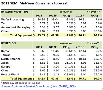 SEMI于北美半導體年度盛會SEMICON West中公布半導體設備資本支出的年中預測報告(SEMI Capital Equipment Forecast),預估2012年全球半導體設備的營收將達到424億美元,2013年將成長至467億美元。