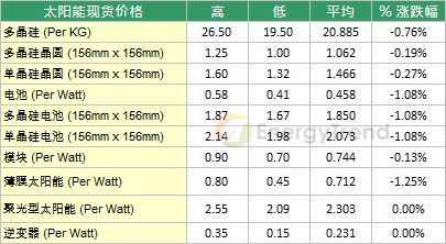 本周的價格趨勢來看,由于市場展望不佳,廠商積極出貨,使得價格出現(xiàn)波動。本周多晶硅價格方面,主要大廠的現(xiàn)貨成交價仍然在$20/kg至$21/kg之間徘徊,但從貿(mào)易商的價格來看,四大廠商的價格已經(jīng)來到$19.5/kg,顯見已有廠商積極出清庫存,對于價格底限的堅持不若以往。本周多晶硅走勢仍緩步下滑,廠商表示目前無法看到現(xiàn)貨價格的底限,本周平均價格來到$20.885/kg,跌幅為0.76%。硅晶圓方面,雖然多數(shù)廠商七月產(chǎn)能已經(jīng)完售,然而受到市場影響,部分廠商價格出現(xiàn)松動,本周市場走勢小幅下滑,目前多晶硅晶圓的平均價位在$1.062/piece,跌幅0.19%;而在單晶硅晶圓方面,仍受到需求與高效多晶產(chǎn)品的雙重挑戰(zhàn),平均價格持續(xù)下滑,本周價位來到$1.466/piece,跌幅為0.27%。在電池與模塊方面,由于歐洲市場展望不佳,價格出現(xiàn)明顯滑落,本周電池半?均價格下滑到$0.458/Watt,跌幅為1.08%;模塊部分則下滑至$0.744/Watt,跌幅為0.13%;另一方面,受到市場需求與硅晶模塊價格均呈現(xiàn)下跌的影響,硅薄膜產(chǎn)品價格再次下滑,本周平均價位來到$0.712/Watt,跌幅為1.25%。<