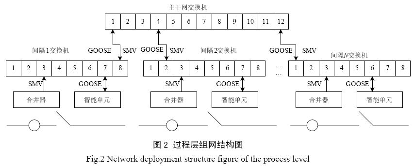 根據IEC61850-7-1標準,過程層和間隔層采用IEC61850-9-1/2協議和GOOSE協議通信,間隔層裝置和站控層采用IEC61850-8-1(MMS)通信。IEC61850-9-1采用點對點傳送方式,只需考慮傳送介質的帶寬和接受方CPU處理數據的能力,而不用擔心數據流量對于其他間隔設備傳輸的影響,因為它并沒有通過網絡與其他間隔共享網絡帶寬,所以不需要交換機。這種方式簡單可靠,但光纖連線繁雜,無法在標準范圍內實現跨間隔保護,安裝方式不靈活。而IEC61850-9-2方式將合并器采樣數據信號以光纖方式接入過程層網絡,間隔層保護、測控、計量等設備不再與合并器直接相連,通過過程層網絡獲取信息數據,從而達到采樣信號的信息共享。通過在交換網絡中采用網絡優先級技術、VLAN技術、組播技術等網絡技術有效的防止采樣值傳輸流量、速度對過程層網絡地影響,保證過程層數據在100M以太網上安全、高效、有序傳輸。