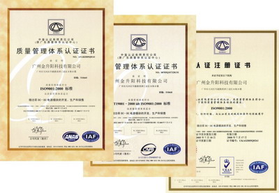 廣州金升陽科技有限公司已于2005年7月18日通過ISO9001:2000質量體系認證的復評,同時通過了ANAB(RAB)、CNAB及UKAS認證。