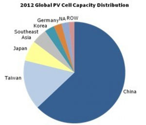 此次“雙反”針對的是中國大陸產光伏電池。根據Solarbuzz的研究(圖一),2012年中國大陸光伏電池產能占全球總產能的63%,其余的產能主要分布在臺灣、日本、東南亞、韓國、歐洲等區域。作為“雙反”發起國的美國電池產能(包括不在此次“雙反”之列的薄膜電池)事實上僅占全球總產能的2%。