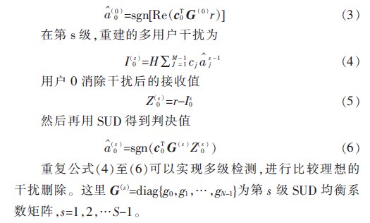 多級檢測的概念一開始是出現(xiàn)在DS-CDMA系統(tǒng)的多用戶系統(tǒng)中,其基本思想是:先由前一級獲得數(shù)據(jù)和干擾的初步估計,然后在后一級消除對干擾的估計,從而提高檢測的可靠性。