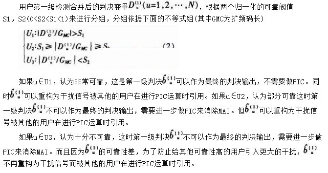 并行干擾消除(PIC),是在同一級檢測中重構出所有用戶信號,然后從總的接收信號中減去所有干擾信號而獲得有用信號。但是由于第一級判決輸出只采用一般的檢測合并技術(單用戶檢測)而存在MAI,所以不能完全正確的重構所有干擾用戶的信號,導致在進行PIC時,有可能引入新的干擾。在這種情況下,某些用戶在第一級判決輸出原本正確,但是由于其他用戶的錯誤判決,而經過PIC后反而變錯。為了避免這一差錯,提出了選擇性并行干擾(S-PIC,Selective Parallel Interference Cancellation),即根據(jù)第一級檢測出來的各個用戶的可靠性分組,來決定是否進行重構,下面介紹其主要思想。