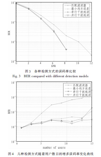 如圖4可見,隨著用戶數(shù)目增加,這幾種檢測方式的誤碼率呈現(xiàn)遞增趨勢。其中匹配濾波器的誤碼率最大。其它三種檢測合并技術的誤碼率小于匹配濾波器的誤碼率。在小信噪比時,MMSE,SIC,PIC的誤碼率較為接近,隨著用戶數(shù)目的增加,最小均方誤差的誤碼率大于串行干擾抵消和并行干擾抵消的誤碼率。當信噪比達到某值時,匹配濾波器的誤碼率最大,而并行干擾抵消的誤碼率最小,是最優(yōu)的多用戶檢測技術。