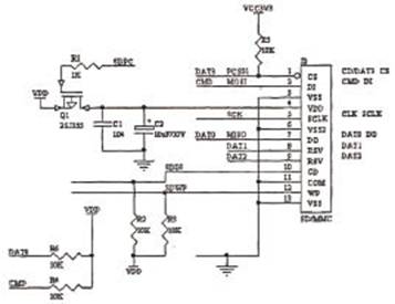 卡檢測電路包括兩部分:卡是否完全插入到卡座中和卡是否寫保護。檢測信號由卡座的兩個引腳以電平的方式輸出。當卡插入到 卡座并插入到位時,SDIN(第10腳)由于卡座內部觸點連接到GND,輸出低電平;當卡拔出時,該引腳由于上拉電阻R2的存在而輸出高電平,該輸出由 FPGA的輸入引腳來檢測。卡是否寫保護的檢測與卡是否完全插入到卡座中的檢測原理是一樣的。
