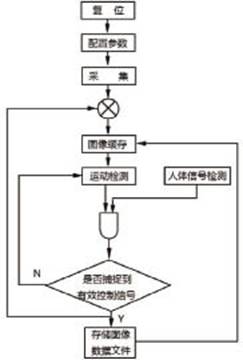 系統工作流程為:系統上電后,FPGA從外部EEPROM自動加載程序,I2C模塊對CIS進行初始化工作參數配置。 CIS向FPGA輸入圖像數據信號,FPGA將采集的原始數據(RAW)轉換成RGB格式,幀緩沖模塊(Frame Buffer)每次將相鄰兩幀圖像數據寫入SDRAM,然后比較這兩幀圖像的差值,如果差值大于設定的閾值,并且人體探測器輸出高電平,就認為檢測到了外 界場景的運動,系統會自動將捕獲的圖像輸出到SD卡進行存儲。圖2給出了系統的工作流程。