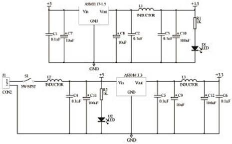 由于采用線性調節原理,LDO本質上沒有輸出紋波。與LDO相比,DC/DC調整器輸出紋波電壓較大、瞬時恢復時間較 慢、容易產生電磁干擾(EMI)。系統電源輸入電壓為5V,3.3V電壓供電部分采用了ASl084;此外,對于FPGA的PLL工作需要的1.5V電源 部分,采用AMS1117-1.5 LDO來實現。