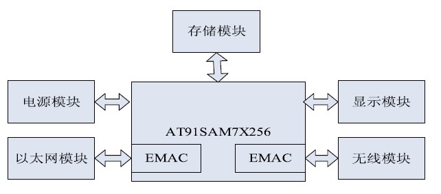 其中AT91SAM7X256 作為整個(gè)基站的主控芯片,由Atmel 公司出品,它集成了ARM7TDMI 處理器,片內(nèi)256KB Flash 和64KB SRAM,還包括了USART、SPI、CAN 控制器、Ethernet 網(wǎng)口等外圍設(shè)備。